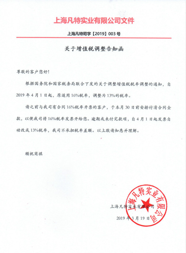 請之前與我司有合同16%稅率開票的客戶,于本月30日前安排付清合同全款,以便我司將16%稅率發(fā)票開給您。逾期或未付完款項,自4月1日起發(fā)票自動改成13%稅率,我司不承擔(dān)稅率差額。以上敬請知悉并理解。