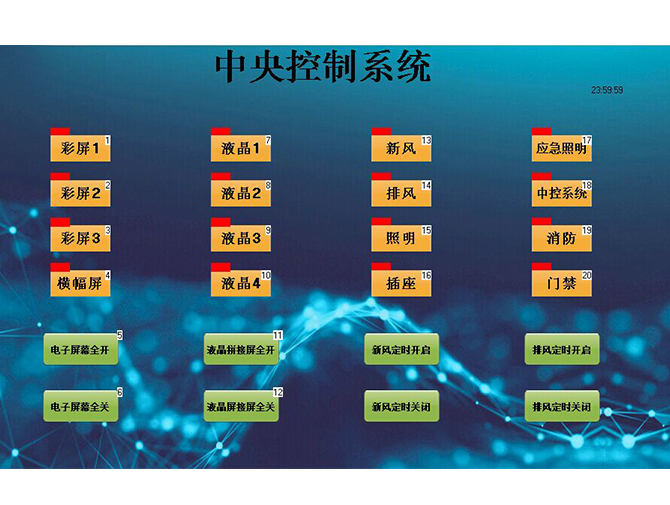 該項(xiàng)目采用VSU總線(xiàn)型智能照明控制系統(tǒng),網(wǎng)關(guān)主機(jī),電源模塊,級(jí)聯(lián)模塊,串口模塊加觸摸屏控制。可通過(guò)中控觸摸屏一鍵控制電子屏幕、液晶拼接屏、新風(fēng)定時(shí)、排風(fēng)定時(shí)等。