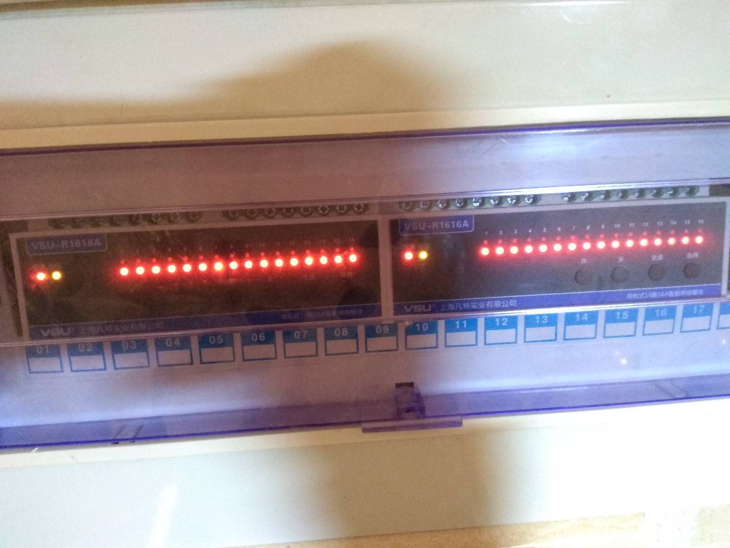 VSU智能照明控制系統(tǒng)實現(xiàn)對燈具的集中控制管理,依靠手機(jī)或者電腦平板就可以一鍵開閉所有燈具。項目采用的VSU照明設(shè)備有:16路16安智能照明模塊、網(wǎng)關(guān)主機(jī)、電源模塊、級聯(lián)模塊、連接片。