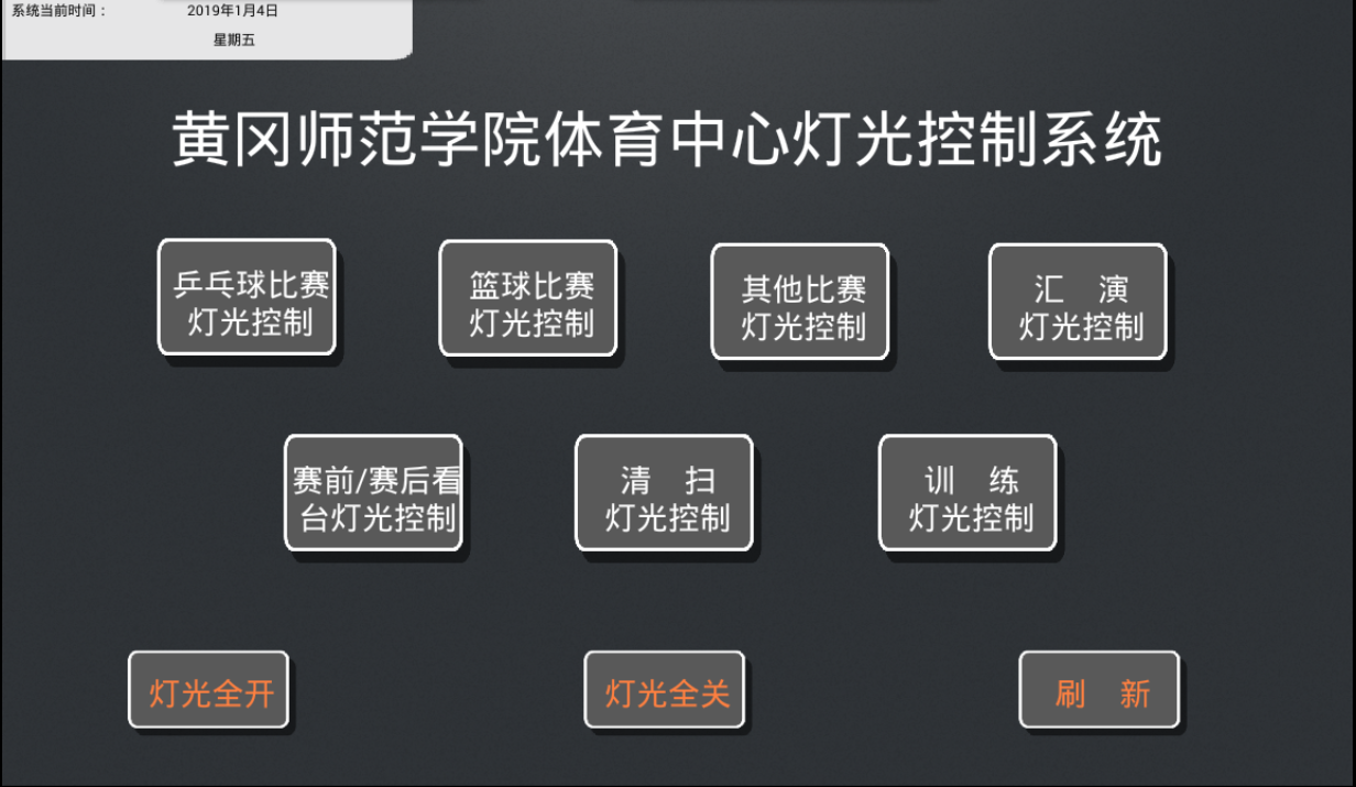 VSU為黃岡師范學(xué)院體育中心實(shí)現(xiàn)燈光智能化控制,多種燈光場景模式任意切換,一鍵開閉館內(nèi)所有燈具。我司根據(jù)客戶需求設(shè)置了以下燈光場景模式:乒乓球比賽、籃球比賽、其他比賽、匯演、賽前/賽后、清掃、訓(xùn)練、全開、全關(guān)。