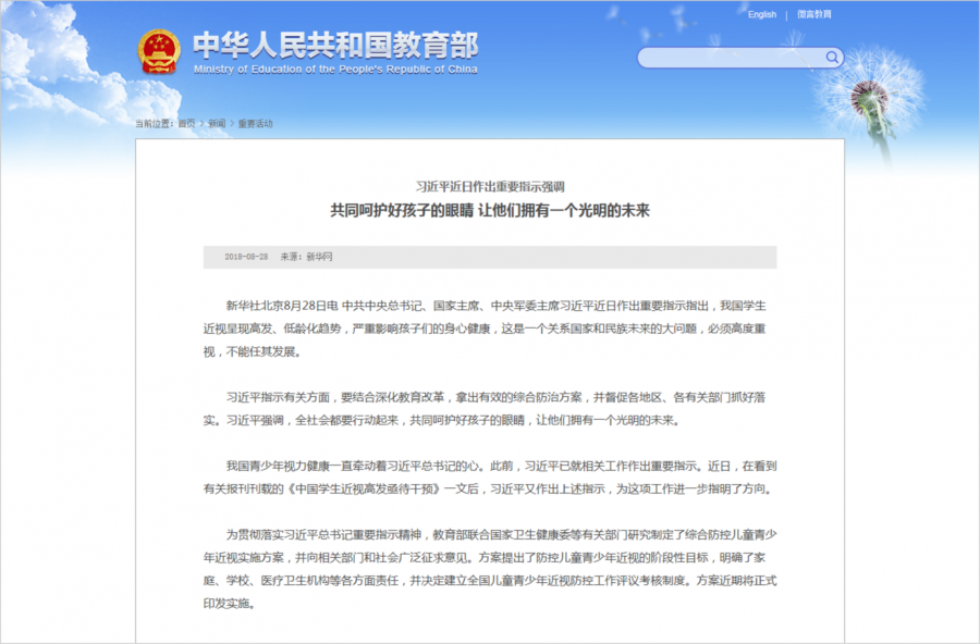 針對近年來我國兒童青少年近視率居高不下、不斷攀升,近視低齡化、重度化日益嚴重等問題,習(xí)近平總書記曾指出:我國學(xué)生近視呈現(xiàn)高發(fā)、低齡化趨勢,嚴重影響孩子們的身心健康,這是一個關(guān)系國家和民族未來的大問題,必須高度重視,不能任其發(fā)展。有關(guān)方面要結(jié)合深化教育改革,拿出有效的綜合防治方案,督促各地區(qū)、各有關(guān)部門抓好落實,同時強調(diào)全社會都要行動起來。