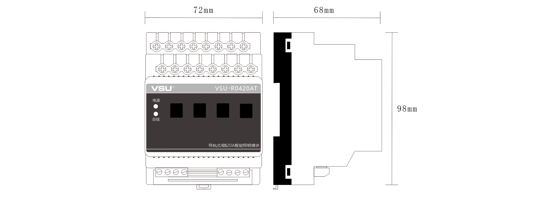 1,標(biāo)準(zhǔn)導(dǎo)軌式安裝占4個(gè)模數(shù)位;