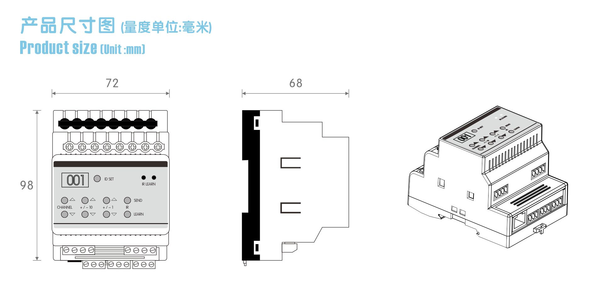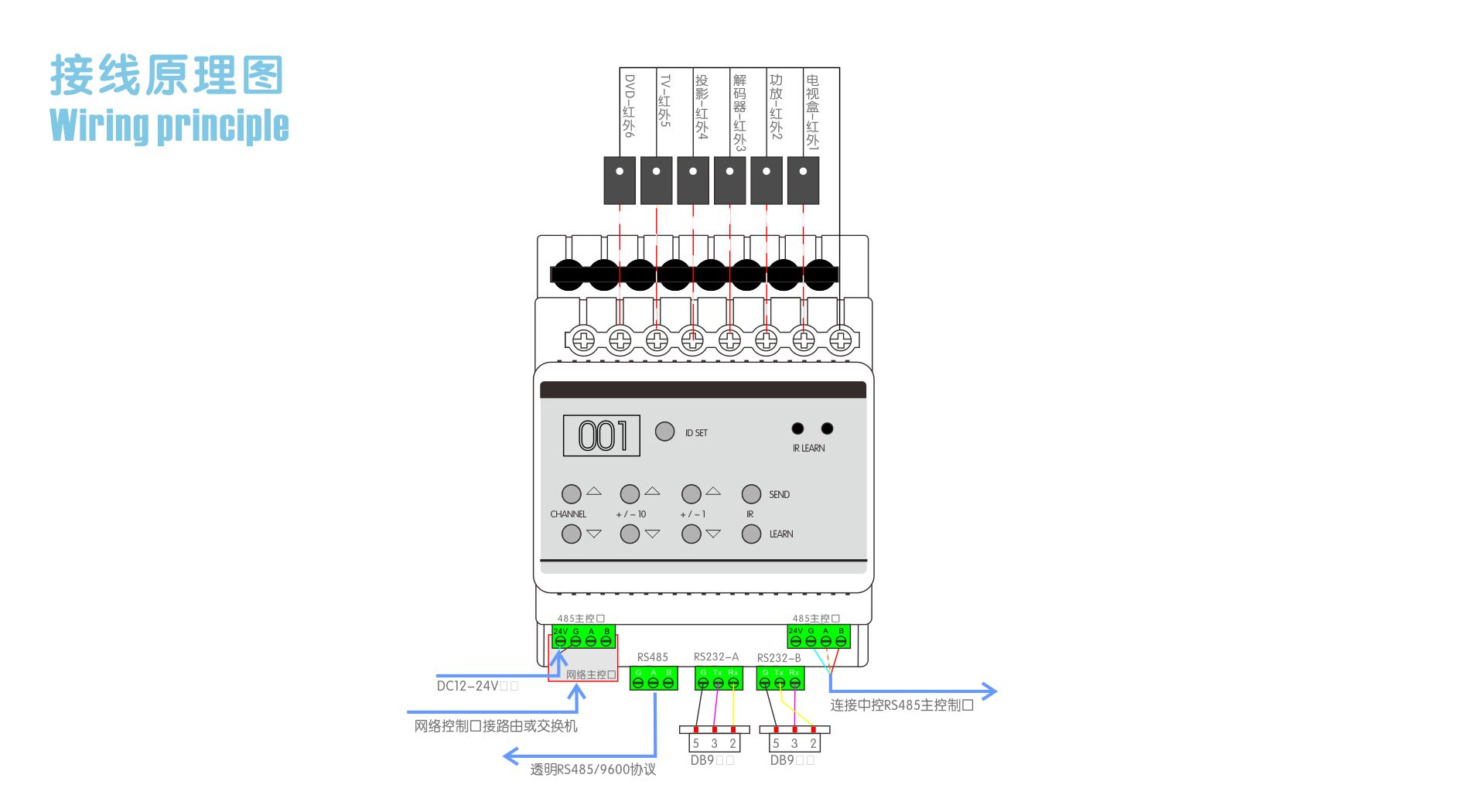 本產(chǎn)品為導(dǎo)軌式安裝,含6路紅外輸出,具備強(qiáng)大紅外能力及兼容性可控制6個(gè)紅外設(shè)備如電視、DVD、空調(diào)等,2路可編程串口控制投影機(jī)和矩陣等設(shè)備,具備強(qiáng)大紅外能力及兼容性; |