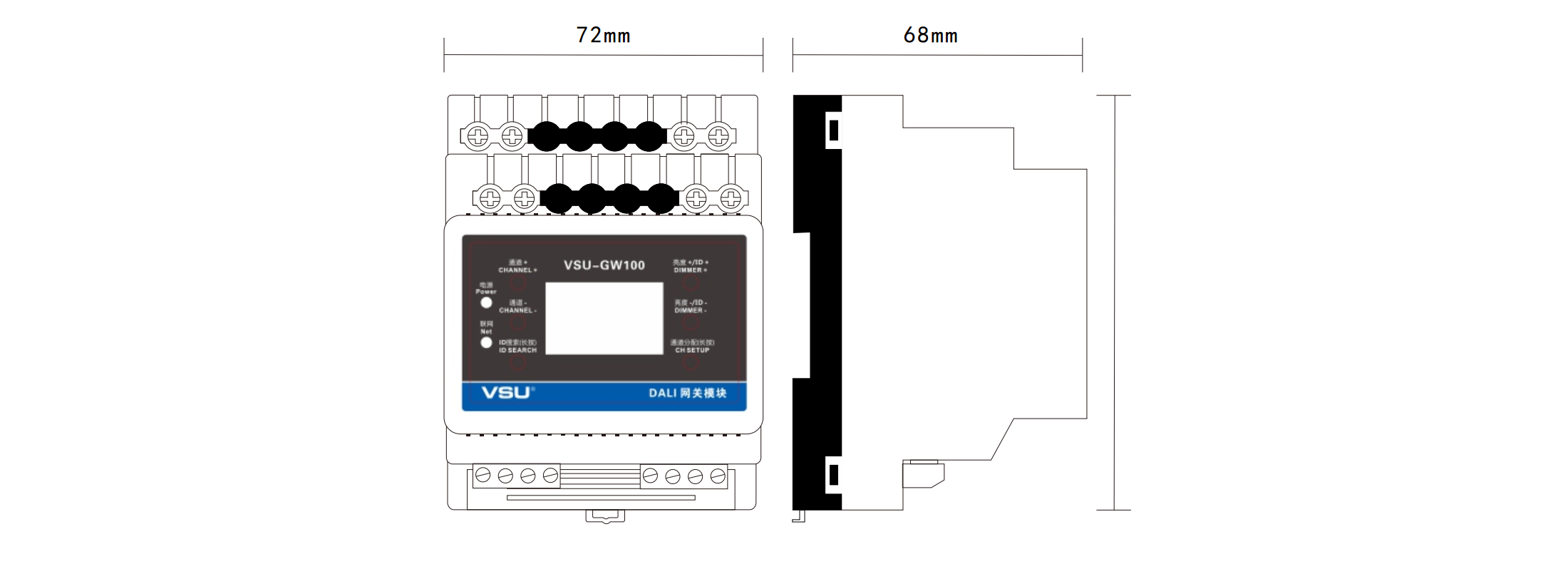 DALI網(wǎng)關(guān)支持VSU-NET協(xié)議與DALI協(xié)議的轉(zhuǎn)換,模塊內(nèi)置DALI電源,具有單條DALI總線,最多支持64個(gè)DALI燈光設(shè)備,最多可具有16個(gè)控制通道。模塊采用OLED顯示屏,方便工程配置與調(diào)試 |